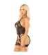 Eleva tu guardarropa íntimo con nuestro Body con Ligueros y Tanga de Rejilla en Negro con Estampados de Corazones.